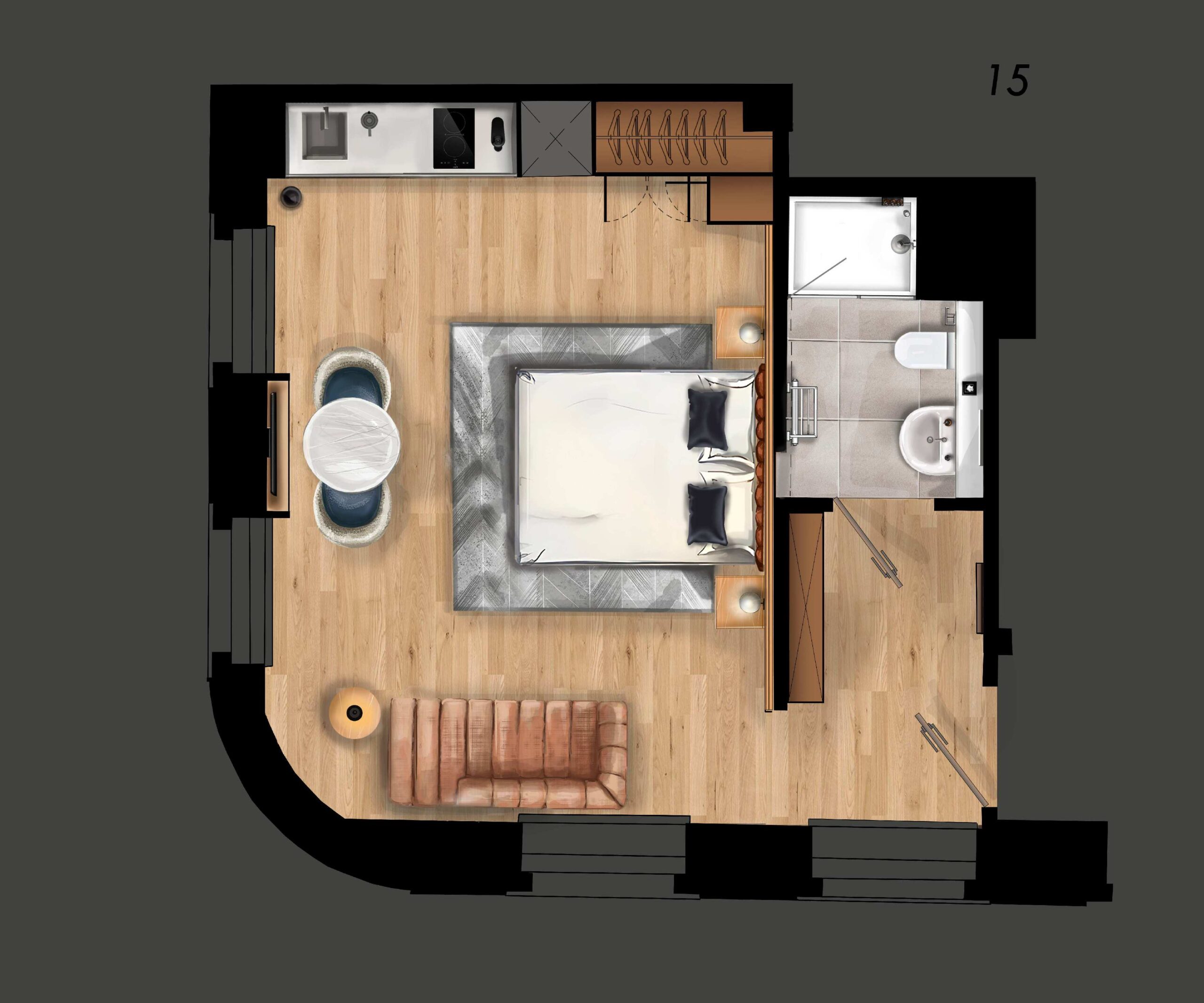 Das Studio mit Schlafsofa im master Cannon vereint auf 30 m² durchdachtes Design mit maximaler Wohnqualität für bis zu 3 Personen. Die Einrichtung verbindet skandinavische Designelemente mit moderner Funktionalität: Warme Neutraltöne, sanfte Braunnuancen und erdige Farben schaffen in Kombination mit edlem Holzboden und schlichten, naturbelassenen Möbeln eine harmonische Atmosphäre.