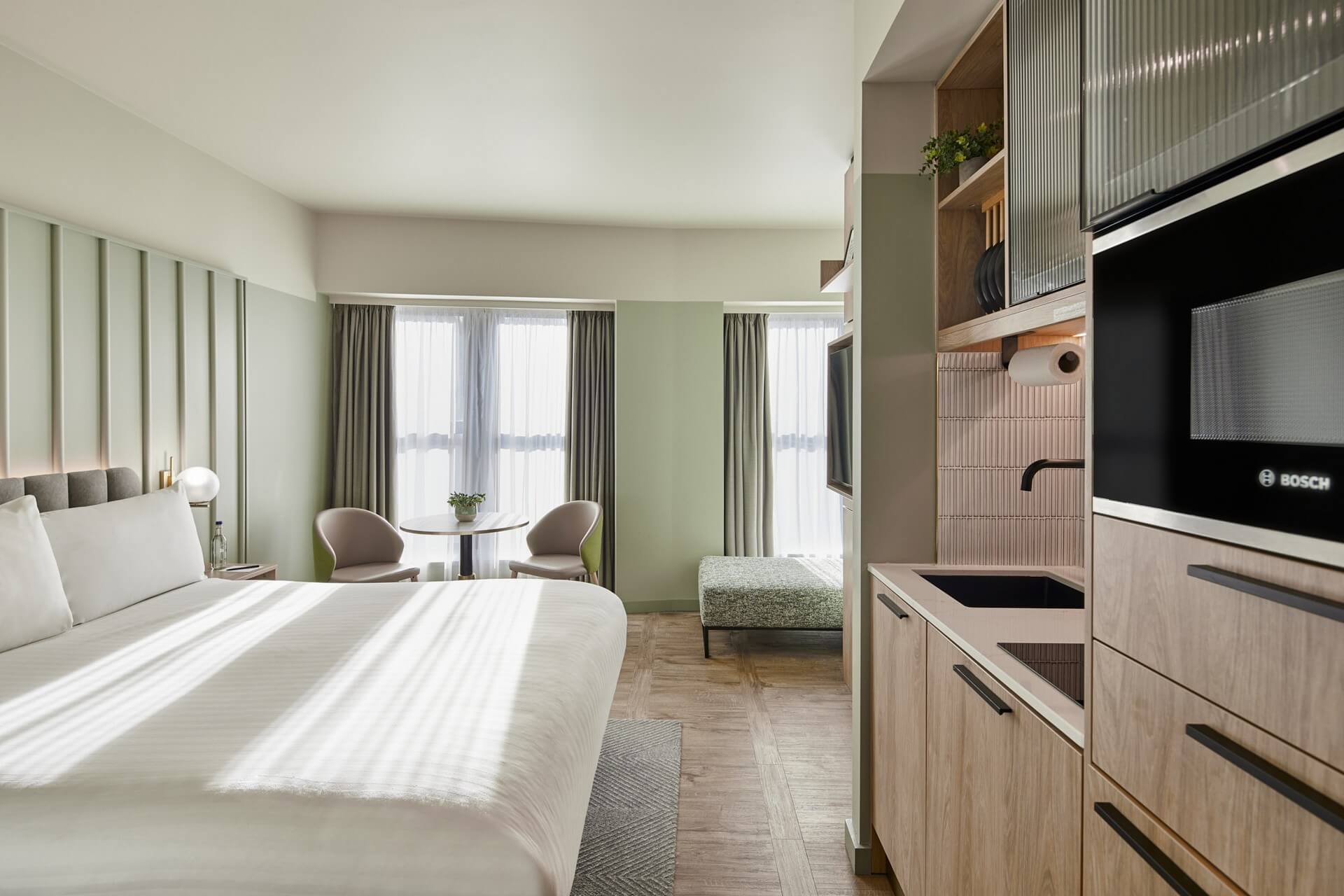 Das Familienapartment besteht aus zwei unterschiedlichen, aber miteinander verbundenen Räumen – dem Lightwell Studio und dem Studio mit Schlafsofa – die durch eine Verbindungstür miteinander verbunden sind. Diese Suite ist durchdacht gestaltet und verfügt über großzügige 50 m² Platz. Sie bietet Ihrer Familie reichlich Raum zum Entspannen, Erholen und Schaffen bleibender Erinnerungen.