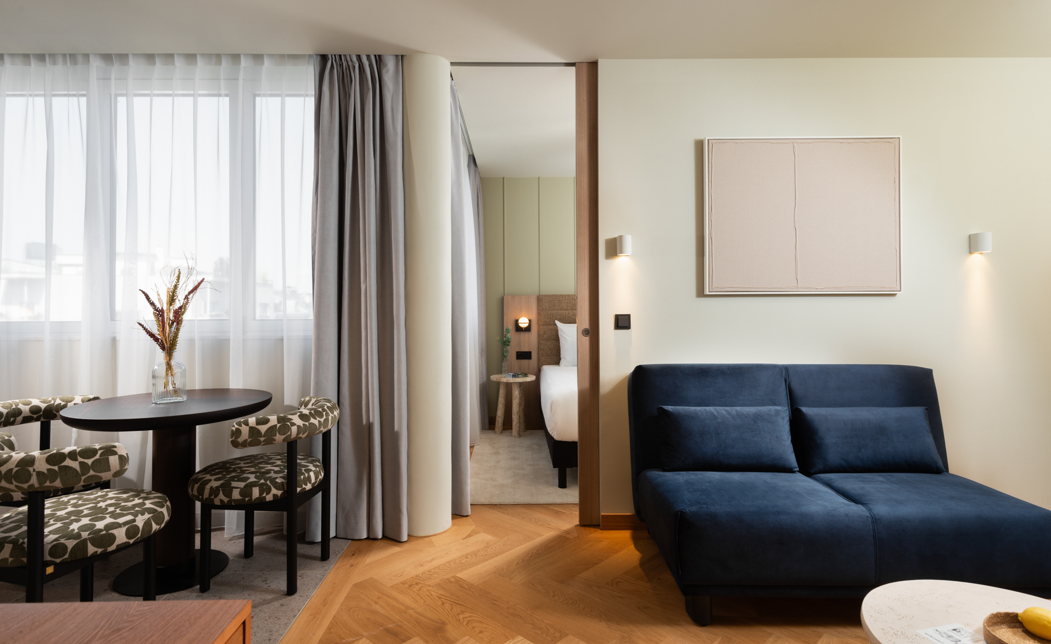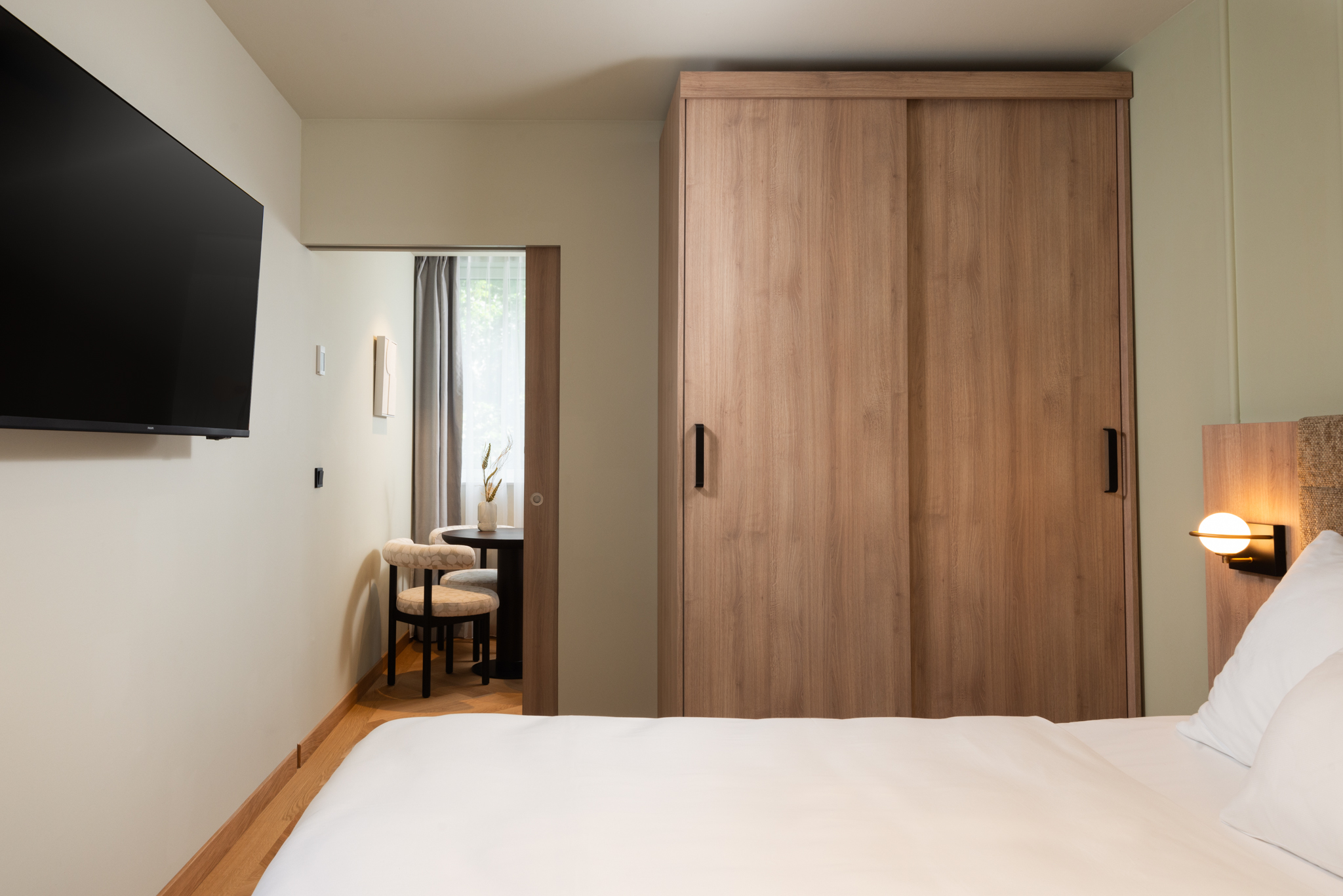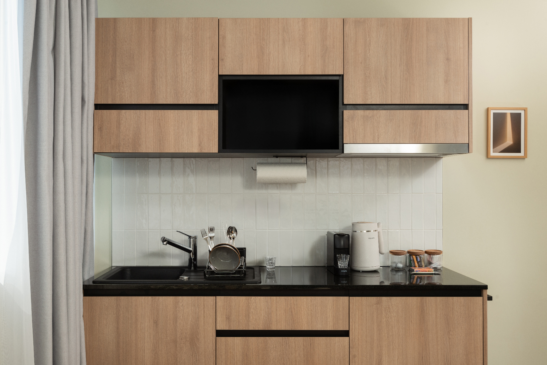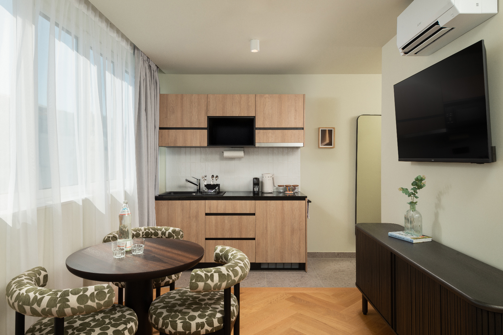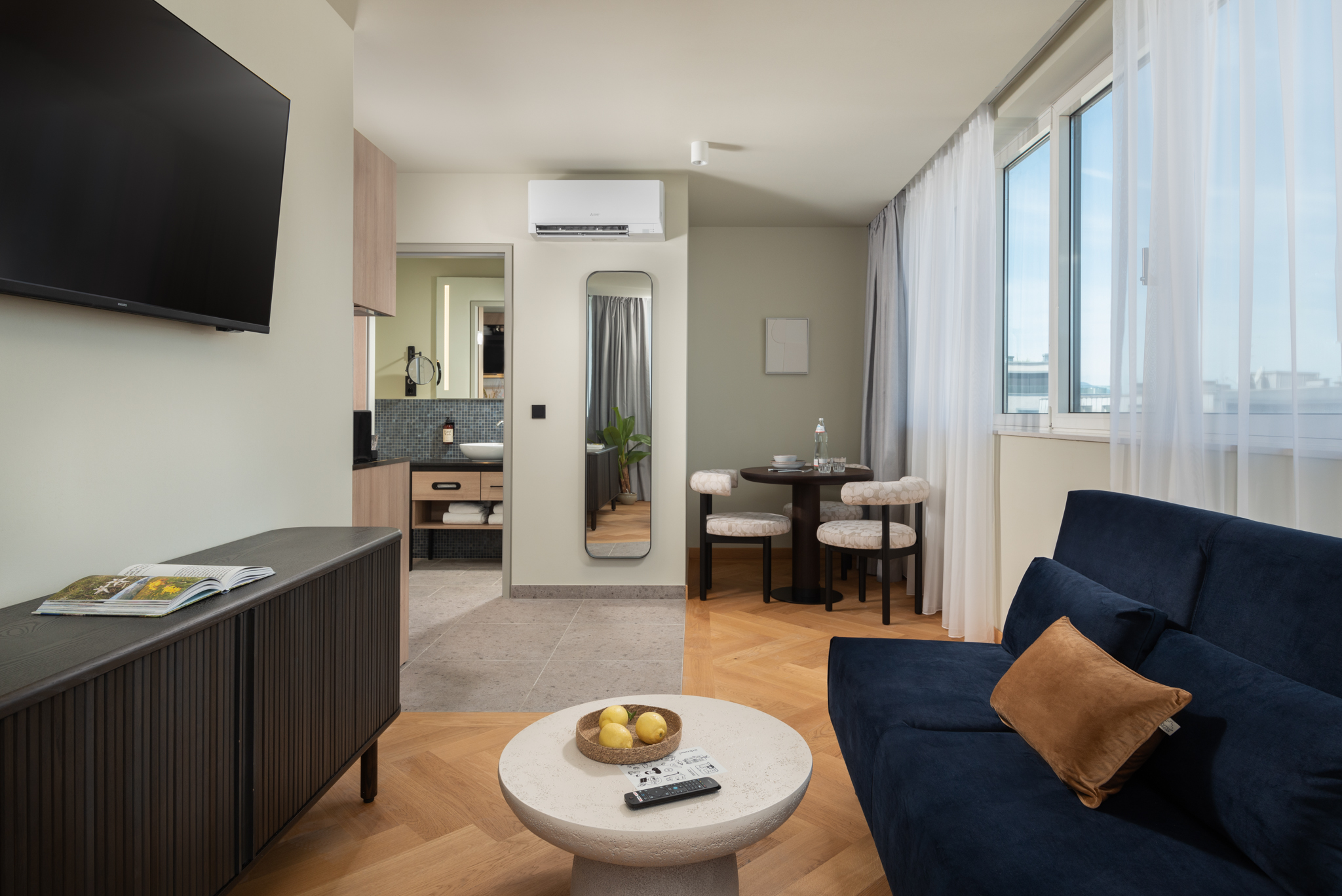 Das Deluxe Suite mit einem Schlafzimmer wurde mit viel Liebe zum Detail gestaltet und vereint Komfort mit Eleganz. Der von natürlichem Licht durchflutete Raum strahlt eine einladende Atmosphäre aus und schafft den perfekten Rahmen zum Entspannen und Erholen. Alle Annehmlichkeiten wurden sorgfältig zusammengestellt, um Ihren Aufenthalt angenehmer zu gestalten, von der Kaffeemaschine für Ihren morgendlichen Kaffeegenuss bis hin zur Ausgestattete Küche mit Geschirrspüler und kompaktem Kühlschrank.