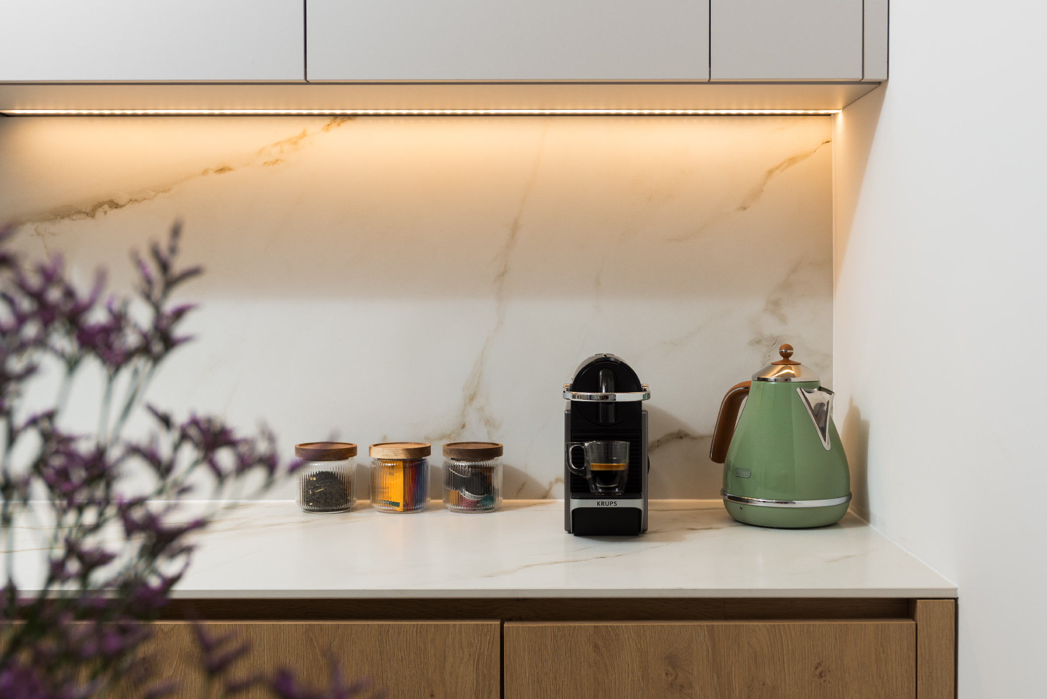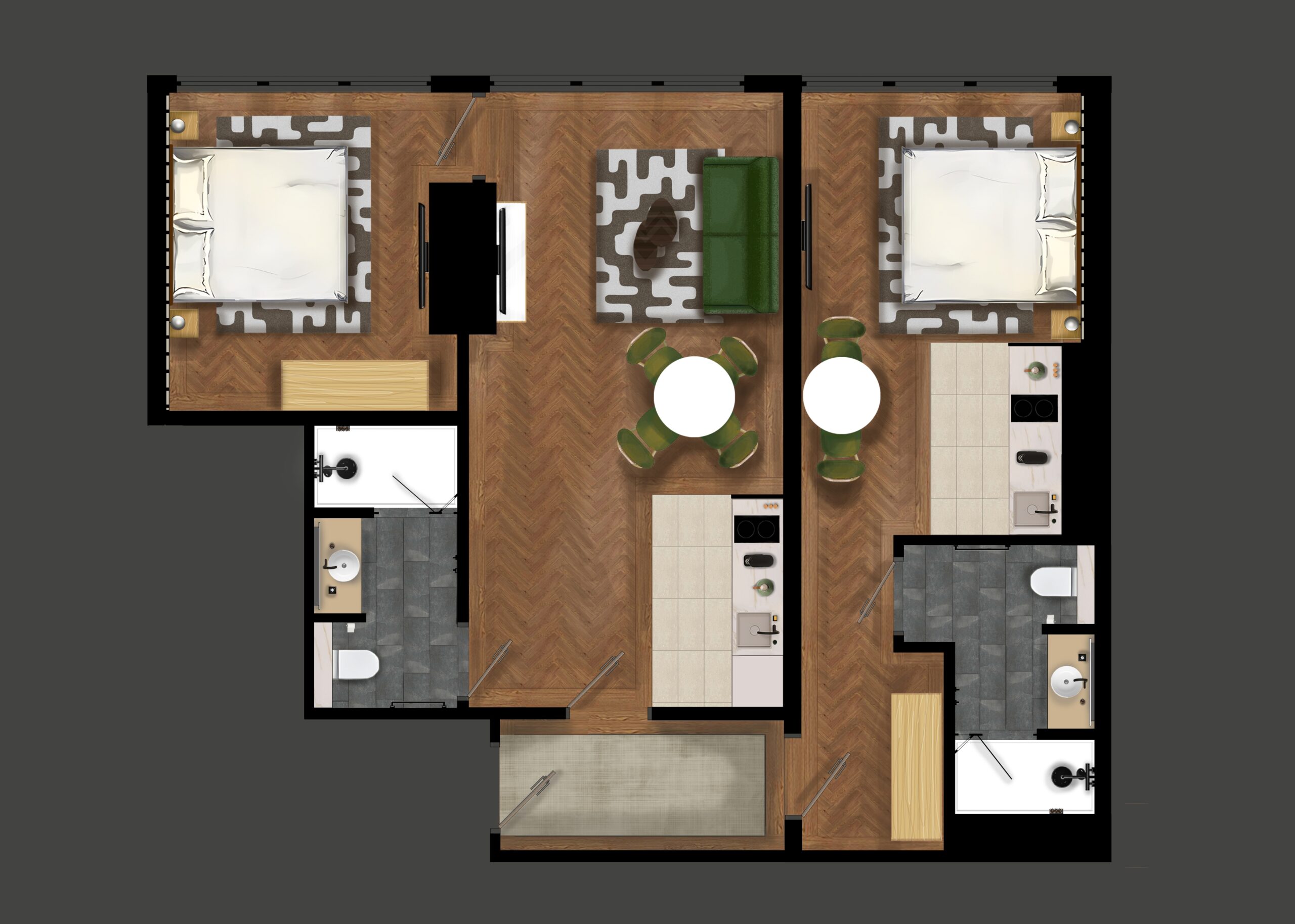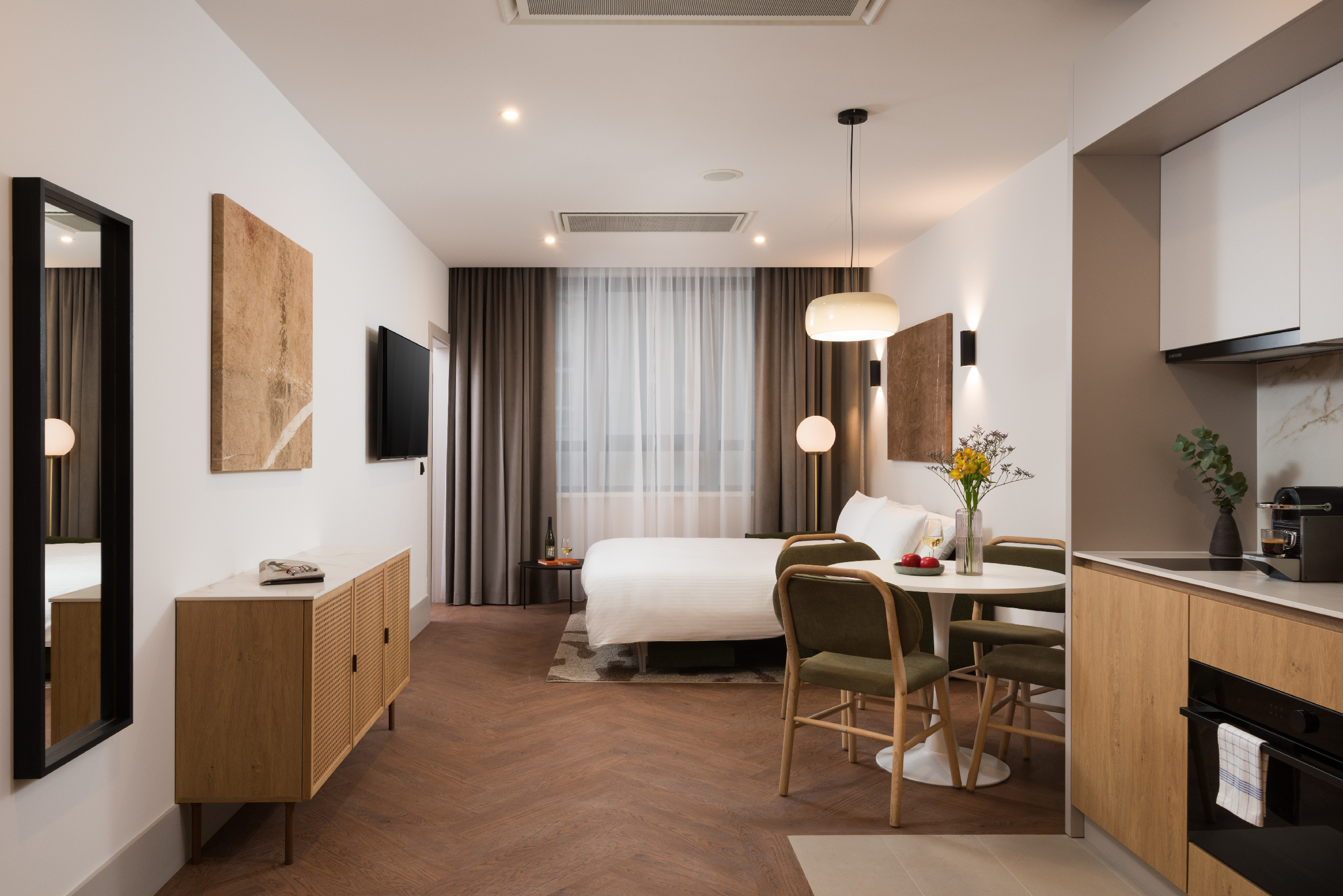 Das Interieur vereint modernen Minimalismus mit wohnlicher Gemütlichkeit und funktionaler Eleganz und schafft eine ruhige und einladende Atmosphäre. Das Apartment verfügt über zwei Schlafzimmer mit Kingsize-Betten, ein Wohnzimmer mit Schlafsofa und einen Essbereich, an dem alle bequem zusammenkommen können.