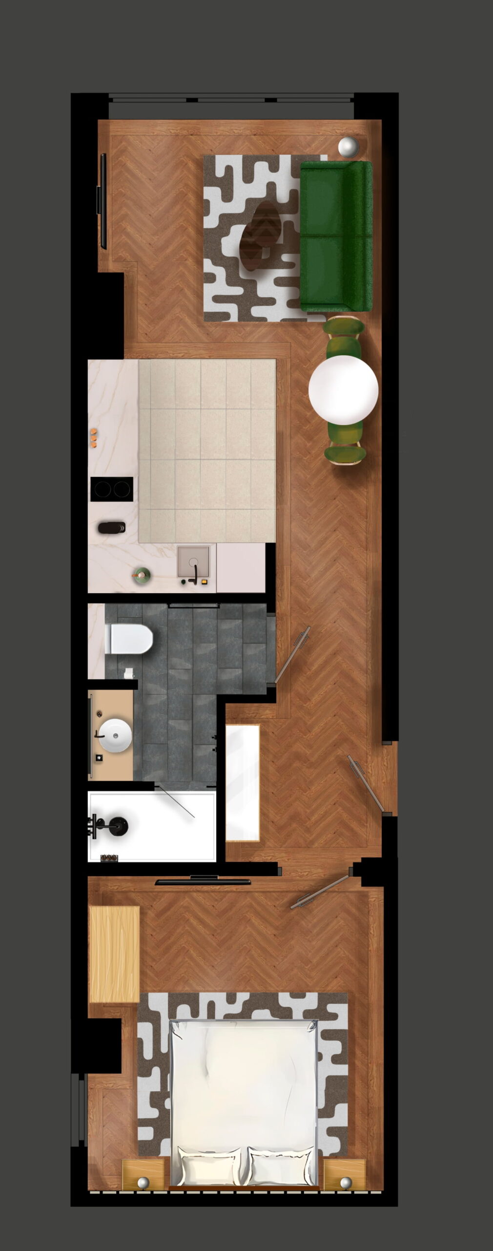 Komfortabel, stilvoll und mit durchdachtem Grundriss – dieses 43 m² große Ein-Schlafzimmer-Apartment im master Wola Serviced Apartments ist ideal für Alleinreisende, Paare oder Geschäftsreisende, die in Warschau Wert auf Platz und Privatsphäre legen.