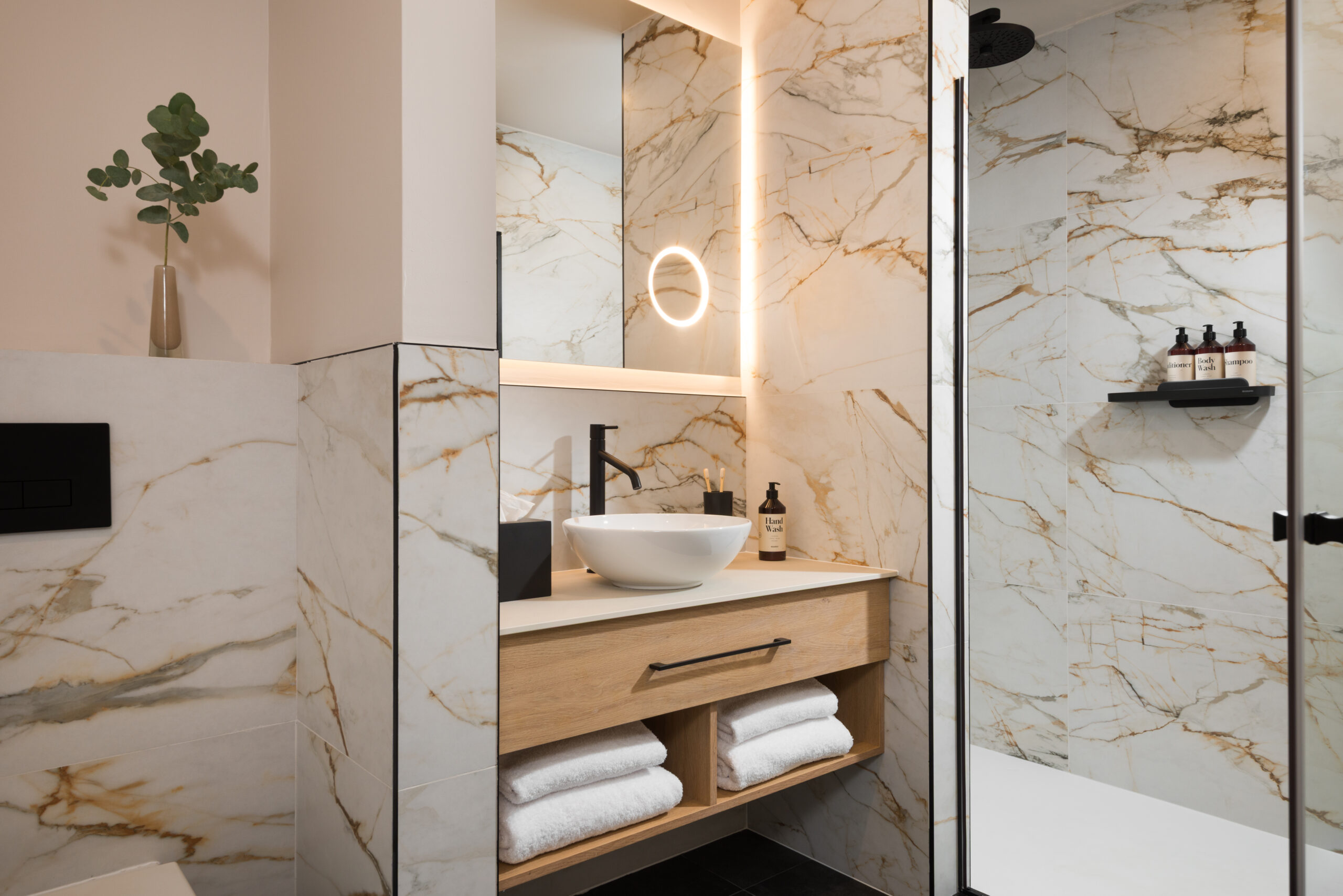 Das Apartment bietet ein separates Schlafzimmer mit Kingsize-Bett, ein Wohnzimmer mit Schlafsofa und einen Essbereich für gemeinsame Mahlzeiten oder konzentriertes Arbeiten. Klare Linien treffen auf warme Materialien und schaffen eine Atmosphäre, die zum Entspannen und Ankommen einlädt.
